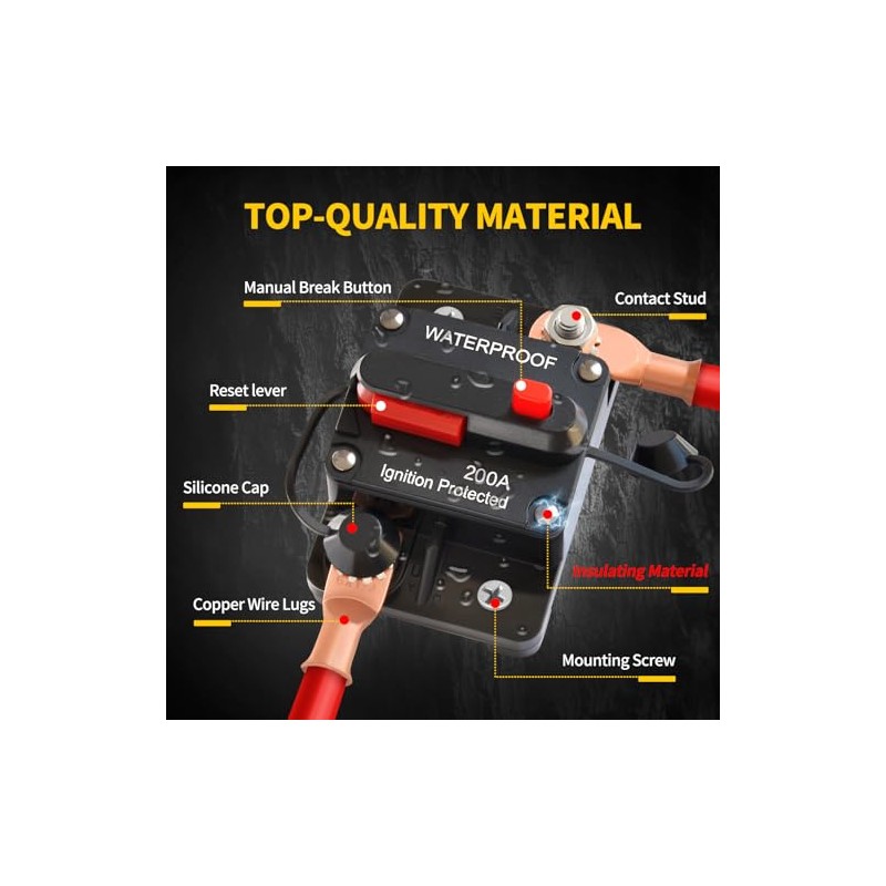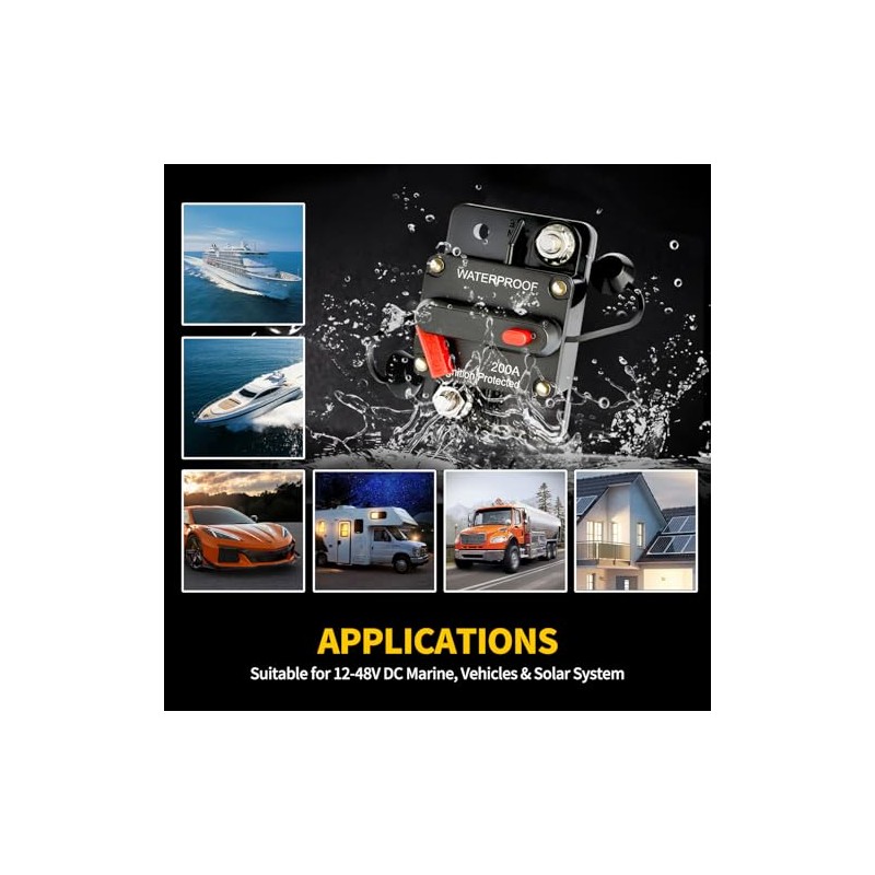 - Specification: 200 Amp Circuit Breaker 12v, Operating Voltage: DC 12V - 48V, Waterproof IP 67, Meet S.A.E. J1625, J1171, UL1500 (Ignition Protected). Widely used in marine and automotive circuits, suitable for Boat, Yacht, Kayak, RV, Trailer, Bus, Truck, Winches, ATV, solar system etc.