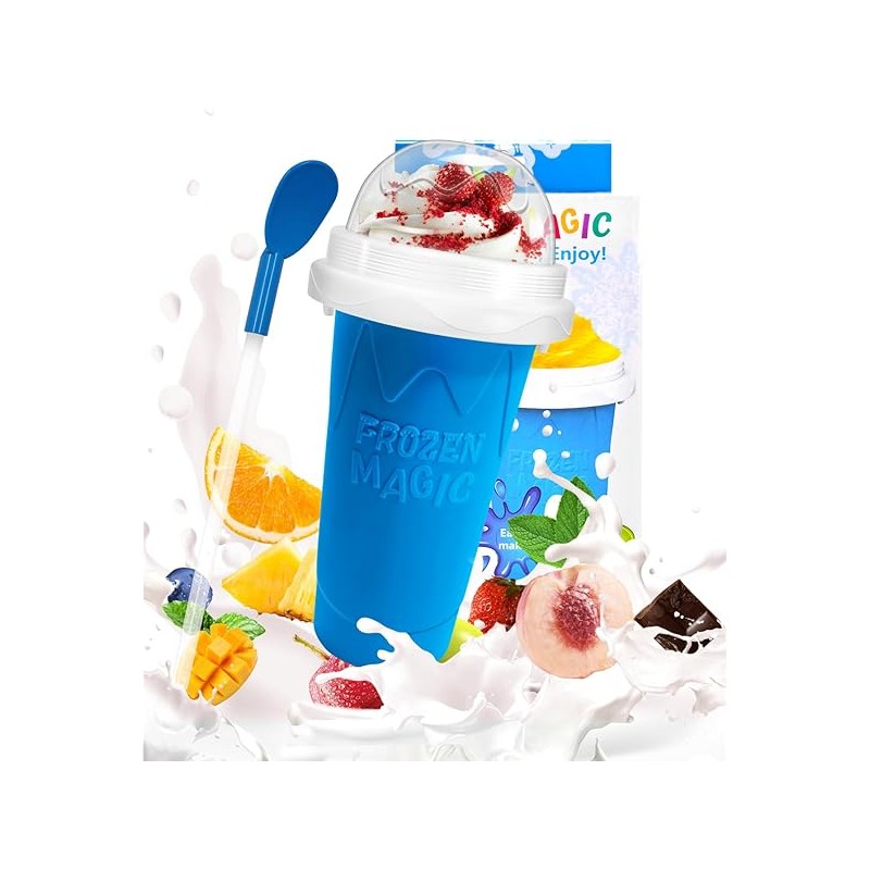 Bollove Slushy Maker Cup, DIY Magic Slushy Maker Squeeze Cup, Portable Smoothie Squeeze Cup for Juices, Milk and Ice Cream Make, Double Layers Silica Cup with Lid & Straw (Blue), 7.87*4.33in