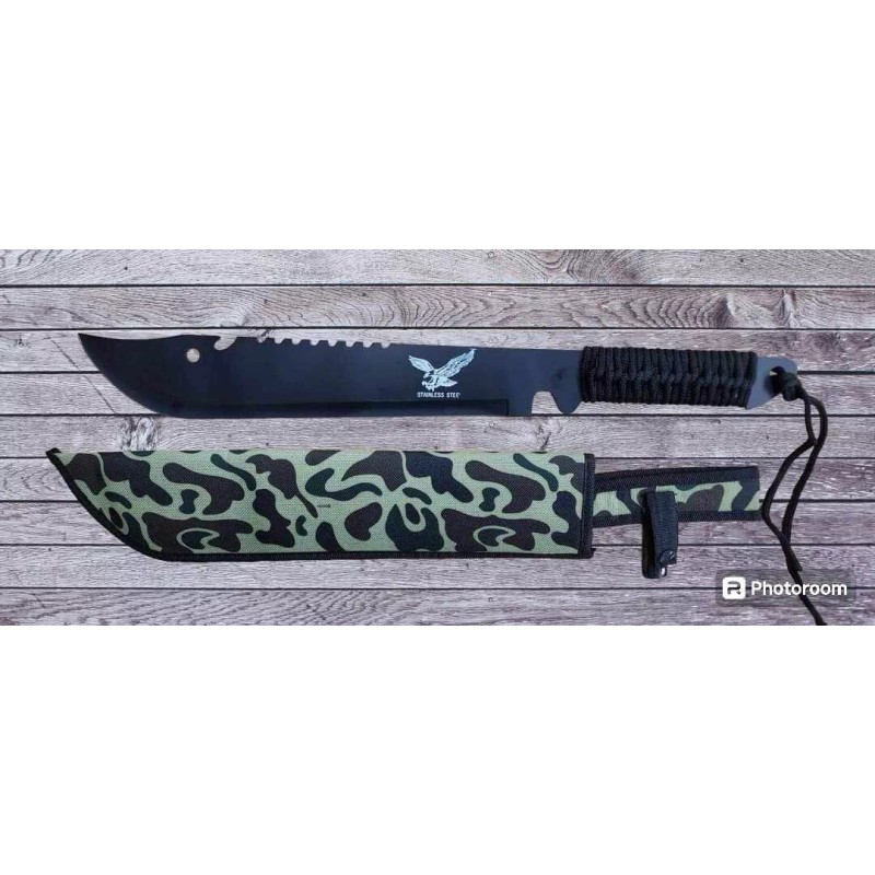 - Make with bag – the survival tool has the following basic data: total length 50 cm – blade length 34.5 cm – blade thickness 2.5 cm – weight 336 g – steel type 420, the blade can be sharpened with a knife sharpener if required.