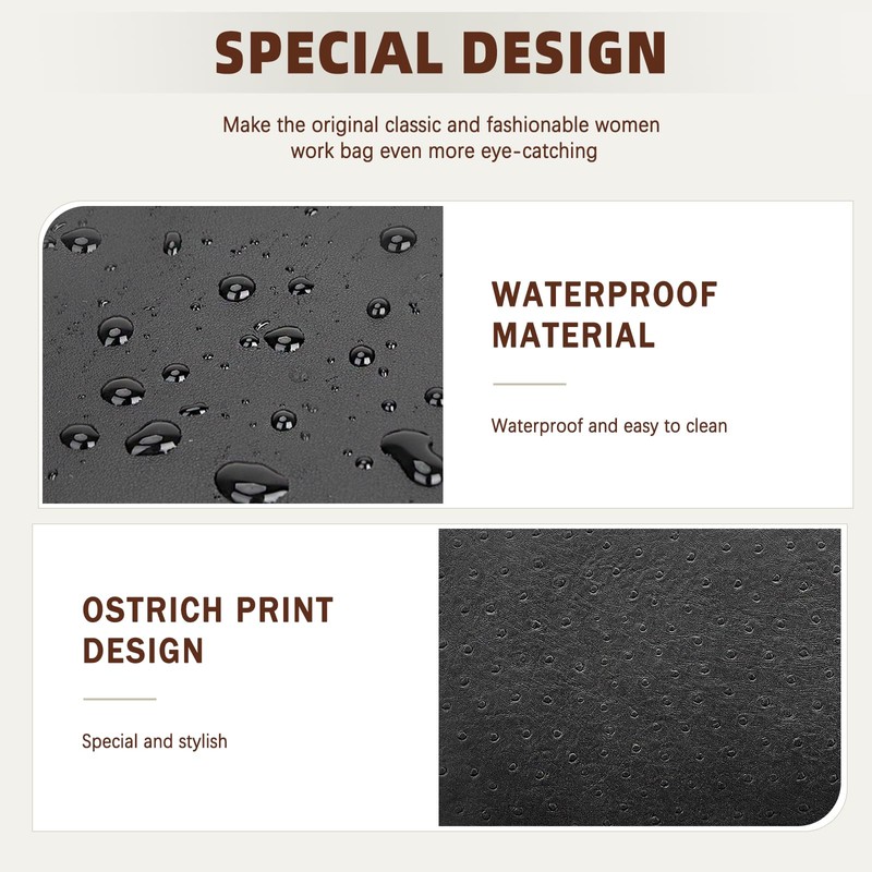 - Elegant & Stylish Design: Women's laptop bag is a perfect combination of high quality waterproof leather and polyester fabrics with a sleek metal design ,stylish and elegant. The ostrich print design on the front adds a stylish and unique touch to the bag. Whether you need a laptop bag or a large tote bag for when you're out and about, this versatile work bag will add elegance to your closet.