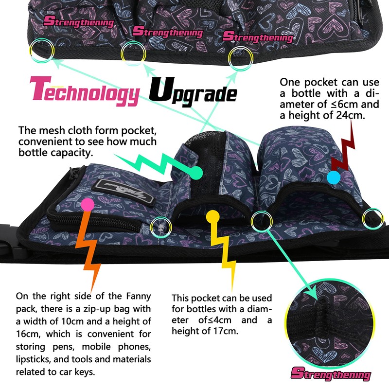 • 2. Tamaño de la cangurera: 29 cm de largo, 19,5 cm de ancho, 3. Diseño: A: El diseño de la bolsa tiene un total de 4 bolsillos separados, la parte delantera tiene dos bolsillos grandes y un pequeño bolsillo oculto se puede utilizar temporalmente para botellas de diferentes capacidades, dos bolsillos grandes disponibles de diámetro ≤ 6 cm de alto, uno de los bolsillos de tela de malla, conveniente para ver cuánta botella capacidad; otro pequeño El bolsillo oculto se puede utilizar para botellas de diámetro ≤ 4 cm, 17 cm de alto