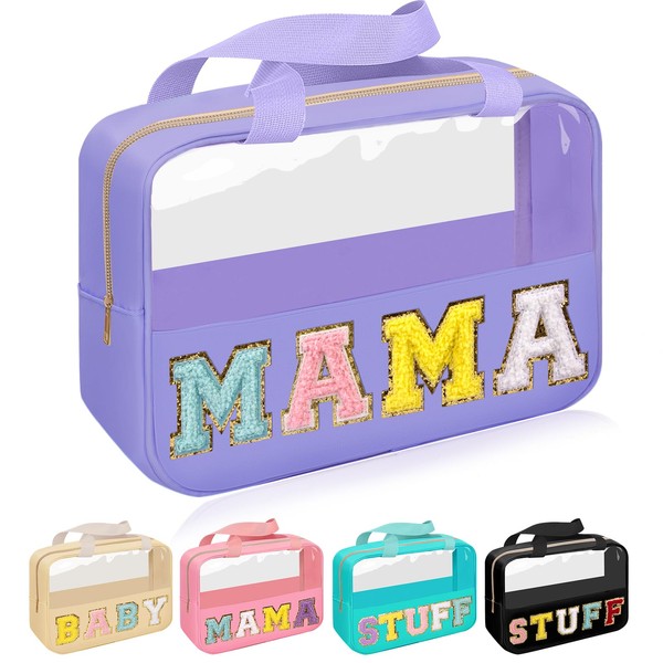 Bolsa de chenilla con parche de carta, bolsa de cosméticos de maquillaje transparente, Morado-mama