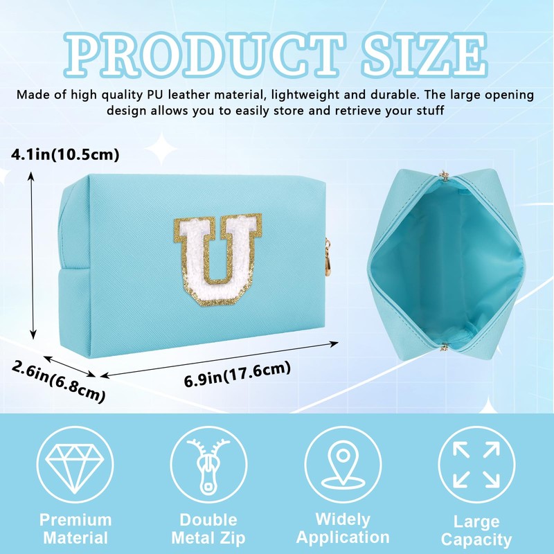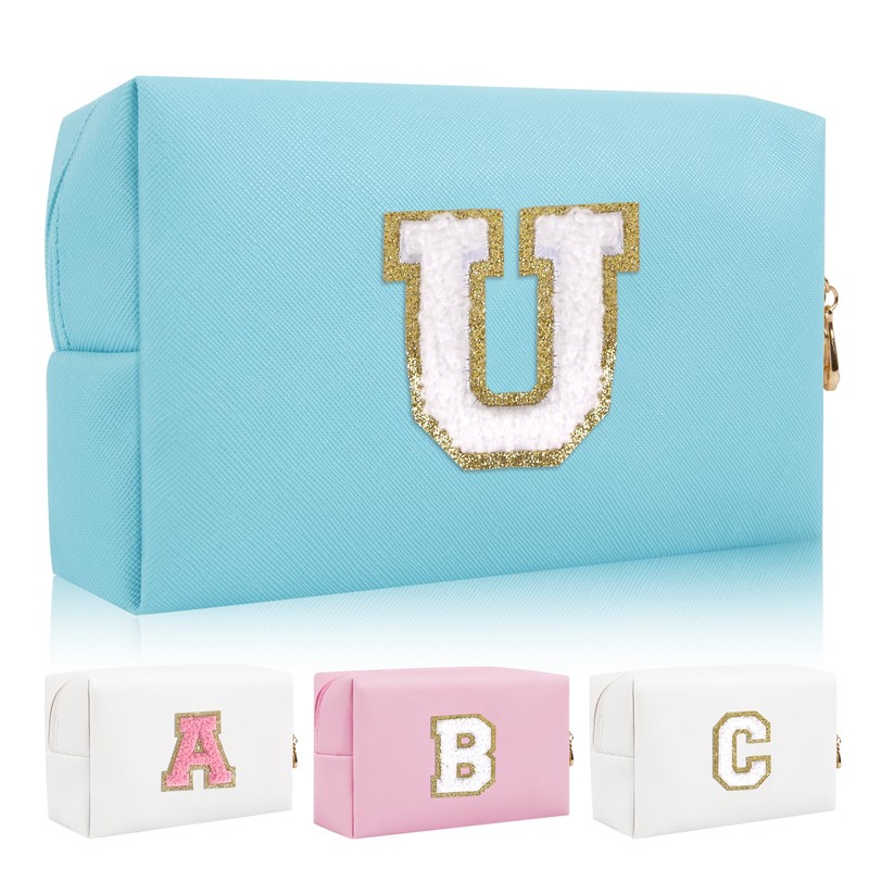 Bolsa de maquillaje personalizada con parche inicial con letras iniciales, bolsa de cosméticos de felpilla portátil con cierre, bolsa de aseo de viaje impermeable de piel sintética, bolsa de maquillaje monograma para mujeres y niñas (letra U)