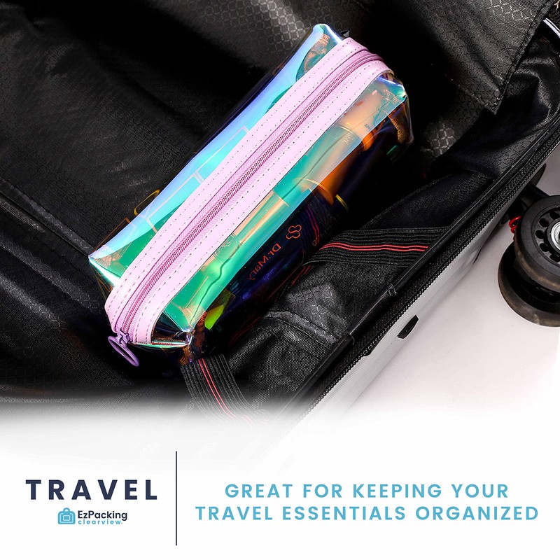Conoce tu nueva bolsa para tus artículos esenciales diarios, la bolsa de maquillaje holográfica de EzPacking. Con su hermoso diseño iridiscente, esta elegante bolsa es una gran adición a tus elementos esenciales de organización. Perfecto para guardar tus cosméticos diarios o guardar tus bolígrafos favoritos.