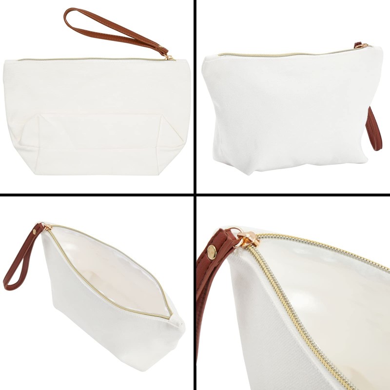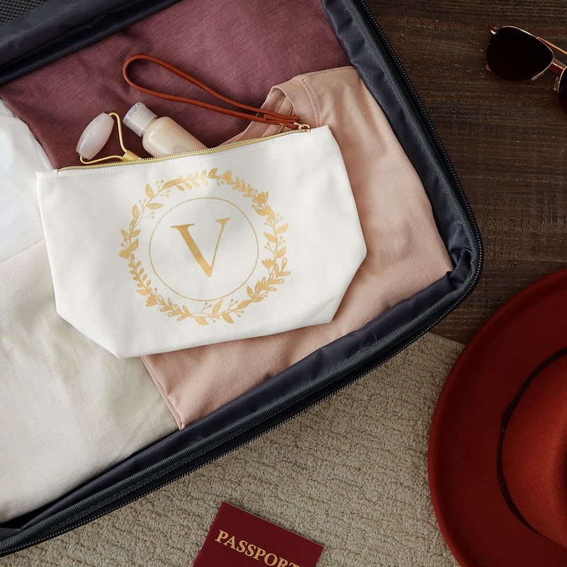 - Bolsa de maquillaje personalizada: almacena suministros cosméticos como brochas de maquillaje, lápiz labial, delineador de ojos, esmalte de uñas y polvos con nuestra bolsa de maquillaje monogramada