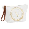 - Elegante diseño monogramado: esta bolsa de maquillaje blanca cuenta con una inicial V de color dorado rodeada por una corona floral decorativa
