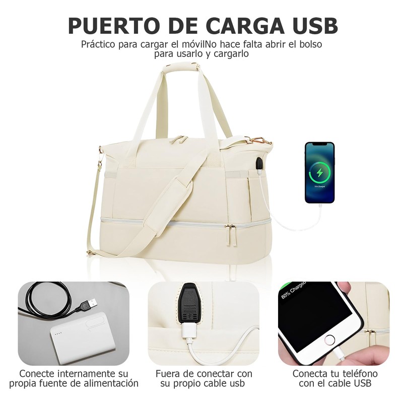 Bolsa para Viaje Mujer, Bolsa de Fitness Impermeable de Gran Capacidad Con Puerto de Carga USB Tipo de Cremallera Diseño Separado en Húmedo y en Seco Bolso Unisex Gimnasio, Vida Diaria(Blanco)