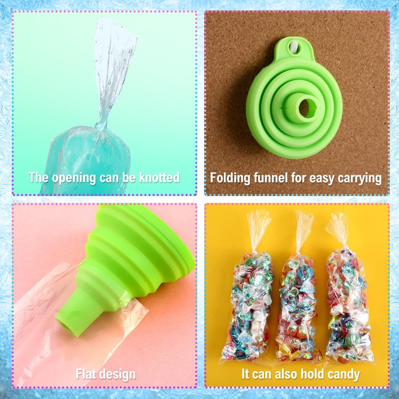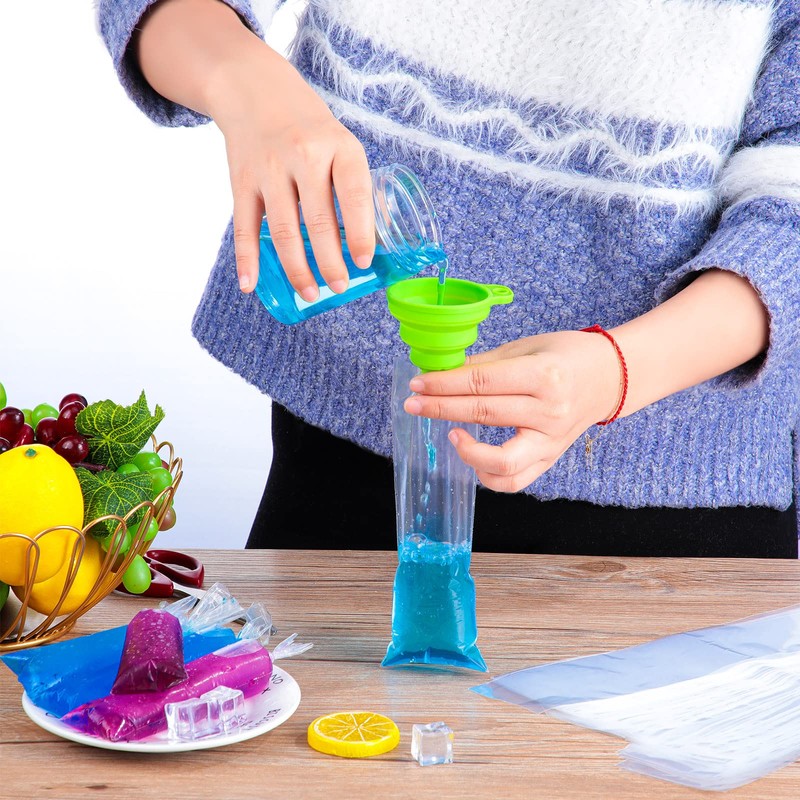 - Cantidad suficiente: recibirás 300 bolsas desechables para paletas de hielo en 3 tamaños, 100 piezas para cada tamaño, gran cantidad y tamaños surtidos para satisfacer tus diferentes necesidades; junto con un embudo plegable de silicona para hacer helados