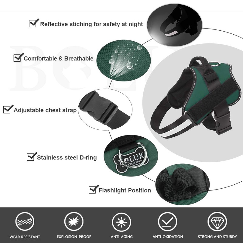 - SUPER COMFORTABLE: Bolux no choke dog harness pulling pressure is evenly distributed to the body to prevent pulling and choking. The dog vest harness have a adjustable chest strap with snap on buckle, move its body parts freely, can customized fits for your puppy growth do not need to always change it.