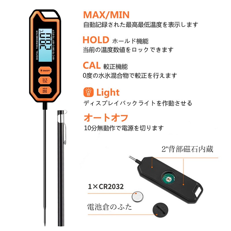 Multifunction: MAX/MIN: Automatically record maximum and minimum temperature. HOLD HOLD FUNCTION: You can lock the previous temperature number. Auto off: Turn off the power with no operation for 10 minutes. Light:Back light to light up the display. CAL-Calibration Function: Can be calibrated with 0 degree water ice mixture.