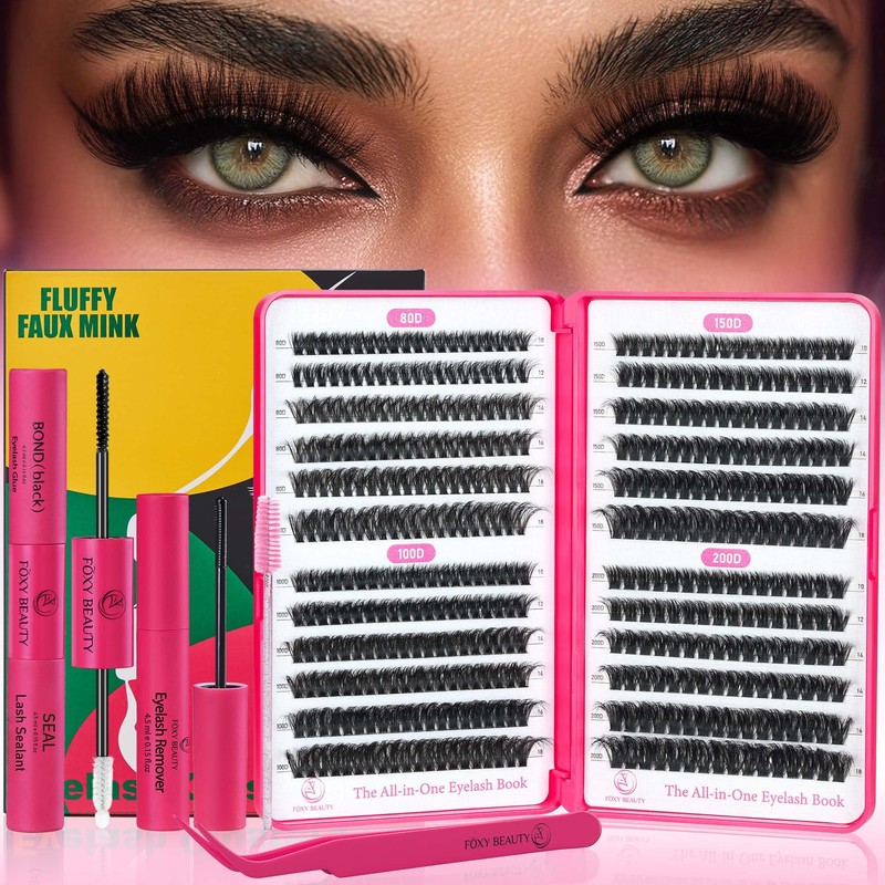 Bombshell X 480Pcs Fluffy Lash Extension Kit 10-18mm 80/100/150/200D Volume Lash Clusters Kit Mink Eyelash Extension Kit Individual Eyelashes with Lash Bond, Lash Remover, Lash Applicator