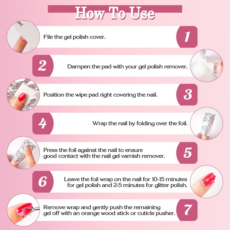 - 【Easy to Use】Just put some pure acetone on the nail polish remover pad and wrap it around fingers or toe nails, wait 5-15 minutes then the gel polish come right off, without any scraping. Disposable wraps is easy to clean