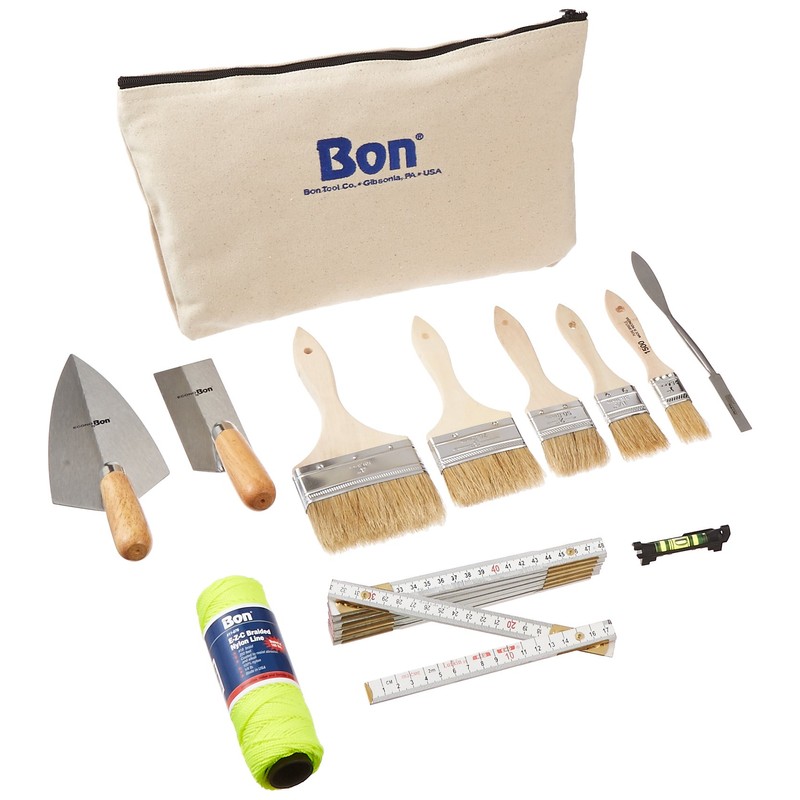 - 15" canvas zipper bag, 5" x 2" margin trowel, 7" x 3" pointing trowel