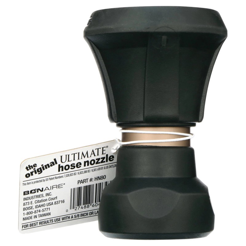 Maximize the potential of your household hose with the Original Ultimate Hose Nozzle by Bon-Aire. Ideal for use around the house, garden, and car, boat, RV, the Ultimate Hose Nozzle features multiple spray patterns, and an ON/OFF flow control switch. Harsher spray patterns can get tough grime and dirt off your car's exterior, while the gentler settings are great for watering your garden. A useful upgrade for your front yard and backyard, make sure to have one Ultimate Hose Nozzle on every hose in and around the house. For best results, Use with a 5/8" or larger hose.
