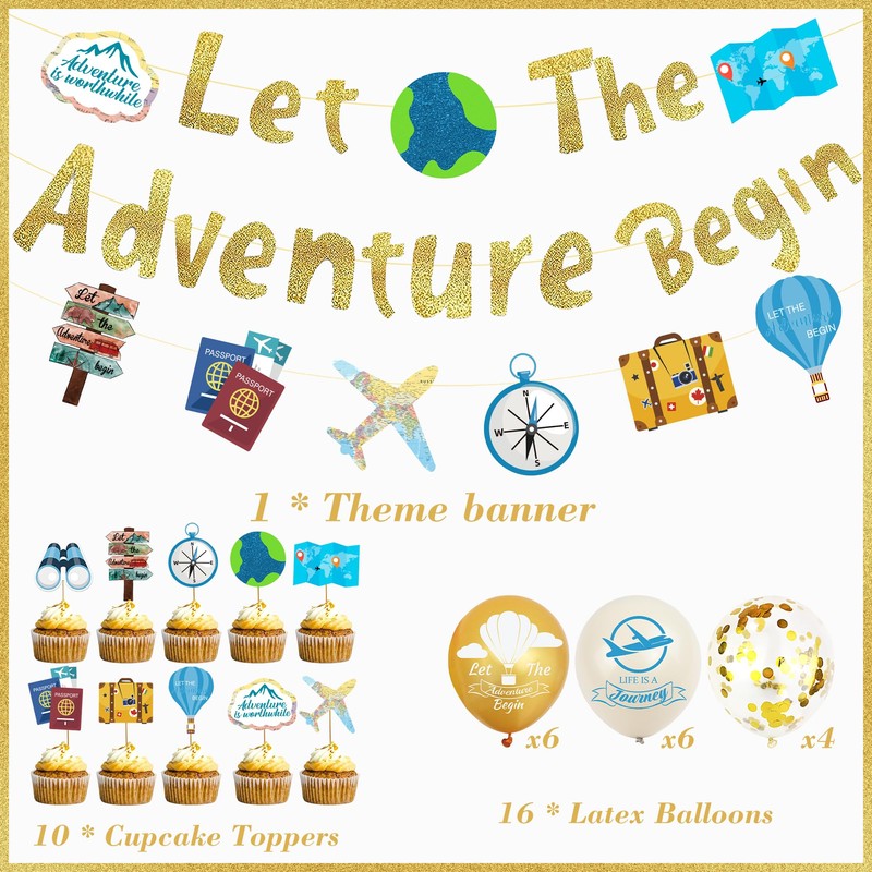 - Package Includes: You will receive 1 gold “Let The Adventure Begin” banners, 10 cupcake toppers, 6 white latex balloons, 6 gold balloons and 4 confetti balloons. This shiny party banner decoration will start your adventure party with confidence