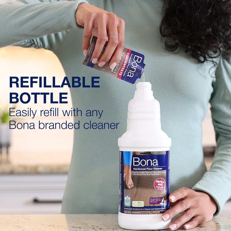- REFILLABLE: Remove bottle cap, refill with Bona cleaner, and screw cap back on. Refill with any economy-size Bona floor cleaner refill or Bona sustainable concentrate pouch