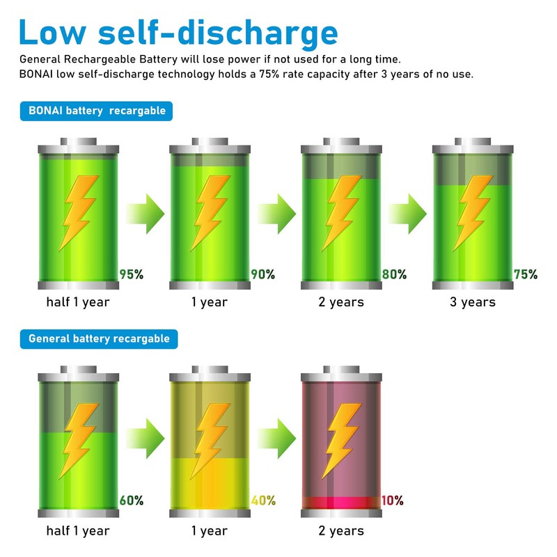 - Low Self-discharge: It will still maintain 80% of initial capacity after 3 year of non-use, it’s highly recommended to be fully charged every 3 months