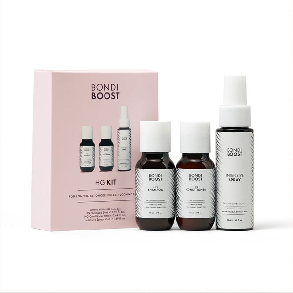 The Bondi Boost Hair Growth Try Me Kit is a comprehensive hair care solution designed to promote hair growth and improve hair health. This kit includes three essential products that work together to nourish your hair from root to tip. The Bondi Boost Hair Growth Try Me Kit is perfect for those looking to try out the Bondi Boost range and experience the benefits of their hair growth formula. Each product in the kit is formulated with natural ingredients that help to strengthen hair, reduce breakage, and support overall hair health. What is included in Bondi Boost Hair Growth Try Me Kit? • Bondi Boost HG Shampoo 50ml• Bondi Boost HG Conditioner 50ml• Bondi Boost Intensive Spray 50ml What are the features and benefits of Bondi Boost Hair Growth Try Me Kit? Bondi Boost HG Shampoo: This shampoo is formulated with a blend of natural ingredients that cleanse the scalp and hair while promoting hair growth. It helps to remove impurities and build-up, leaving your hair feeling fresh and revitalized. Bondi Boost HG Conditioner: The conditioner works to hydrate and nourish your hair, making it softer and more manageable. It contains ingredients that strengthen the hair shaft and reduce breakage, ensuring your hair stays healthy and strong. Bondi Boost Intensive Spray: This intensive spray is designed to target the scalp and provide a concentrated dose of nutrients that support hair growth. It helps to stimulate the hair follicles and improve blood circulation, promoting healthier and thicker hair. Who is Bondi Boost Hair Growth Try Me Kit for? This kit is perfect for anyone looking to improve their hair health and promote hair growth.