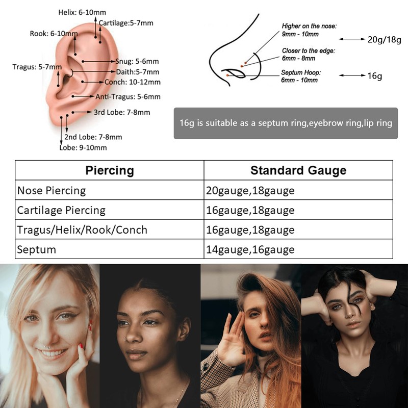 - Body Piercing Jewelry Size: the nose rings hoops gauge size: 18g(1mm), inner diameter: 6mm ( 1/4 inch ), 8mm ( 5/16 inch ), 10mm ( 3/8 inch ). Small nose stud gauge size: 20g(0.8mm), 2mm/2.5mm/3mm cubic zirconia, bar length: 7mm. Horseshoe ring gauge size: 18g(1mm), inner diameter: 6mm ( 1/4 inch ), 8mm ( 5/16 inch ), 10mm ( 3/8 inch ).