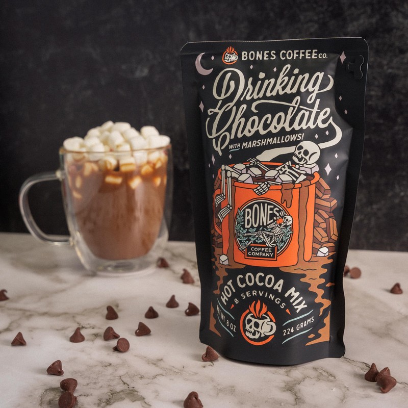 Bones Coffee Company Hot Chocolate Mix – Dairy Free Hot Cocoa with Natural Cane Sugar & Cacao Powder Arriba Nacional Drinking Chocolate with Mini Marshmallows, 8 Servings