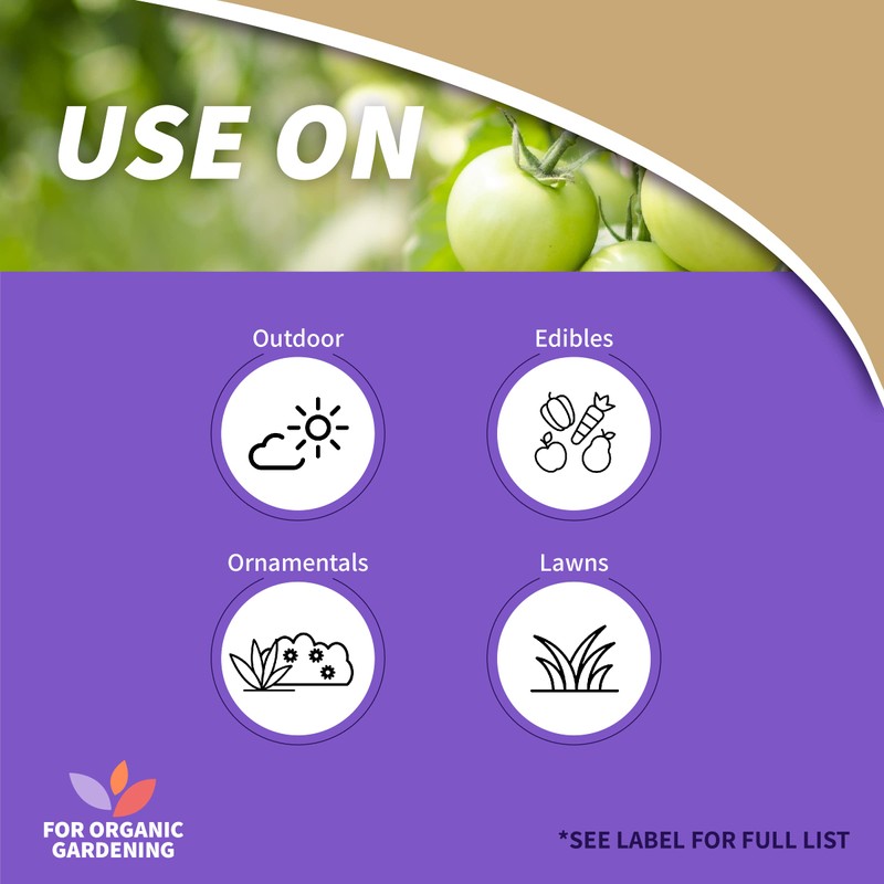 Dead Bug Brew kills bagworms, borers, beetles, caterpillars, codling moth, gypsy moth, loopers, leaf miners, spider mites, tent caterpillars, thrips and more. Designed for outdoor residential use in home gardens, lawns, and ornamentals. Contains Spinosad, which is a leading pesticide used worldwide in the production of organic produce. Arrives in a ready-to-use container with a spray nozzle.