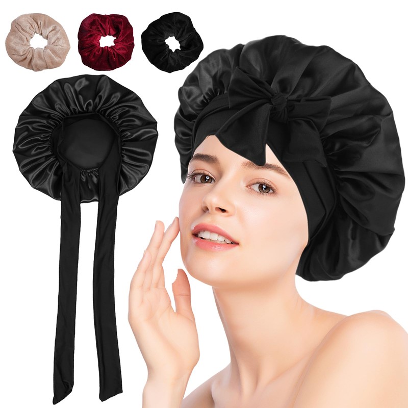 - Set includes: you will receive 1 black silk bonnet sleep cap and 3 hair bands, the diameter of the cap is 38 cm/14.96 inches, the hair band can be extended up to 18 cm/7.09 inches, enough sizes to meet the needs of different scenarios and different hairstyles.