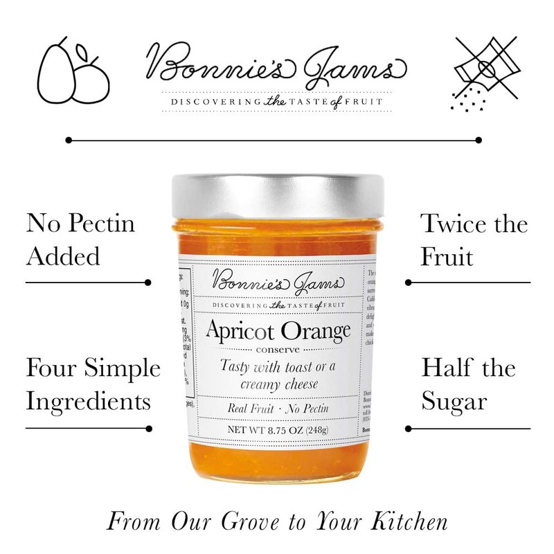 - SIMPLE INGREDIENTS: Apricots, Valencia oranges, cane sugar, lemon juice. Our fruit jams do not include any added pectin, allowing the flavors of the fruit to shine bright.