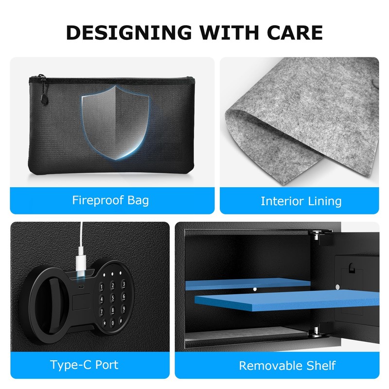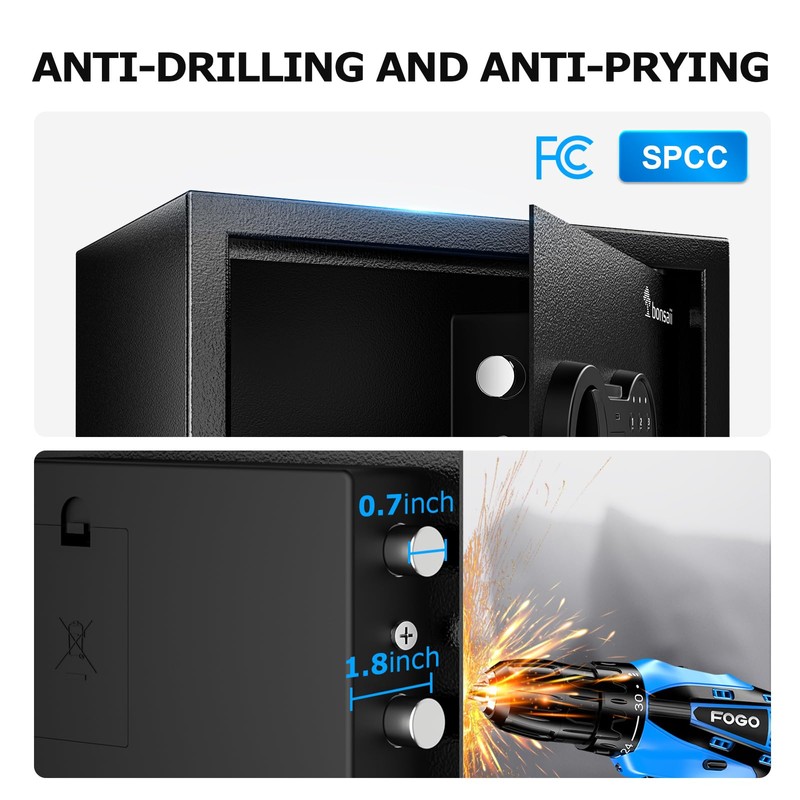 - FCC CERTIFIED QUALITY: Made from SPCC steel, this safe is built to last and exudes strength and dependability; It features two 18mm diameter locking bolts, providing reliable security and protection for your valuables; Rest assured of the FCC-certified quality of our product, which is designed to deliver dependable performance over time