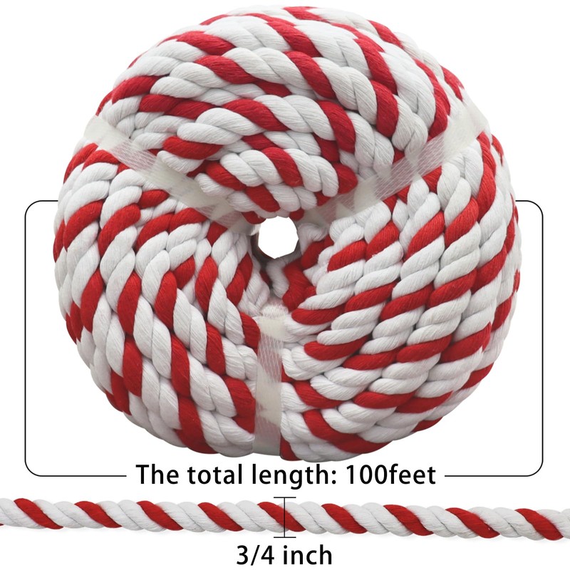 BONSINY Cotton Rope 3/4 inch x 100 feet - 3 Strand Twisted Red and White Rope for Crafts Landscaping Tug of War DIY Projects