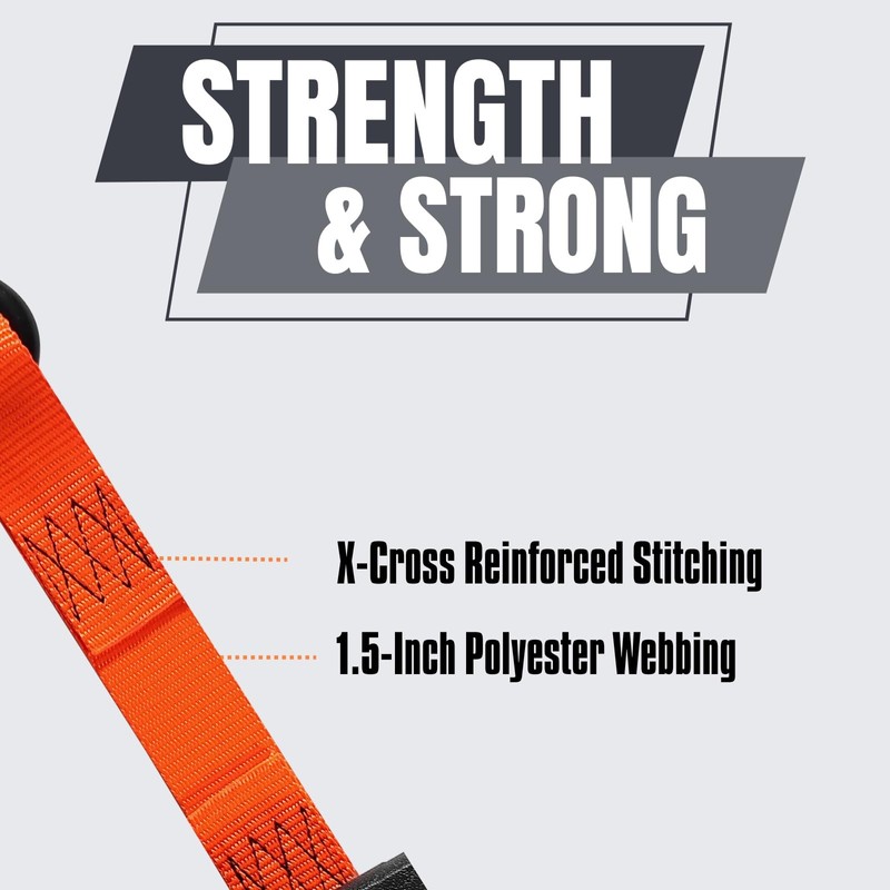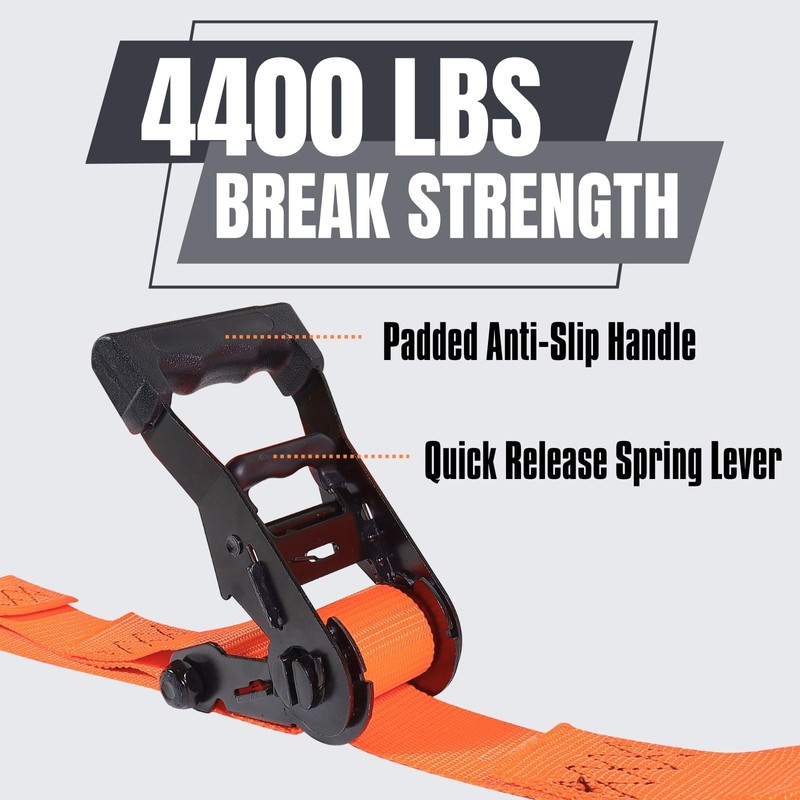 - HEAVY DUTY 4400 BREAK STRENGTH The 1.5-inch wide ratchet buckle and webbing has break strength of 4400 lbs, which is stronger and powerful than 1-inch regular ratchet strap. Our reinforced polyester webbing comes with triple X-stitching pattern for extra strength and long product lifetime.