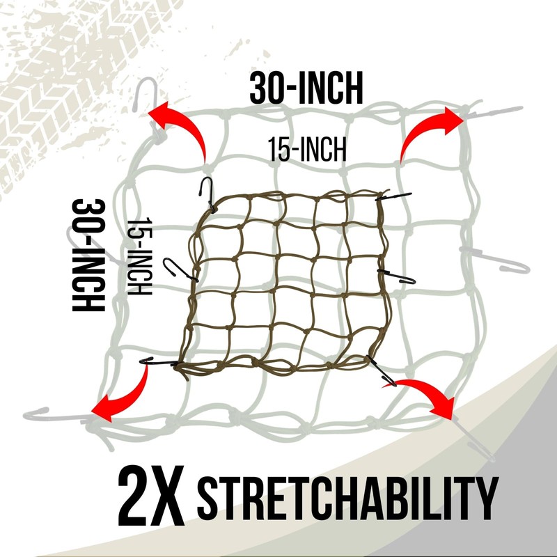 • MESH NETTING- Featured 3”x3” grid netting holds cargo better and helps prevent small objects from slipping through. This small cargo net stretches up to 30"x30" and retains its shape even when not stretched, ensuring long-lasting performance