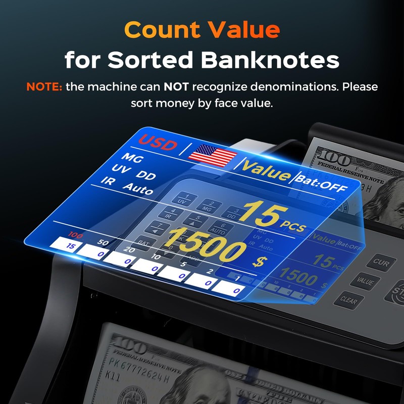 • Count Sorted Banknote - Cash counter machine can count the value of sorted bills in value mode. Please sort the money by face value first.