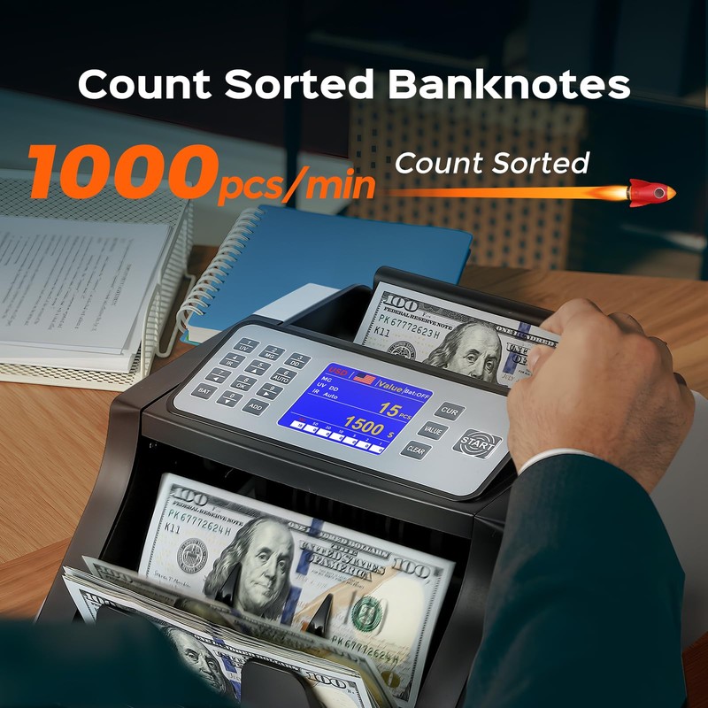 • Count 1,000 Bills per Minute - Equipped with upgraded roller, money counting machine can count 1,000 bills per minute, which makes it suitable for handling large amounts of banknotes.
