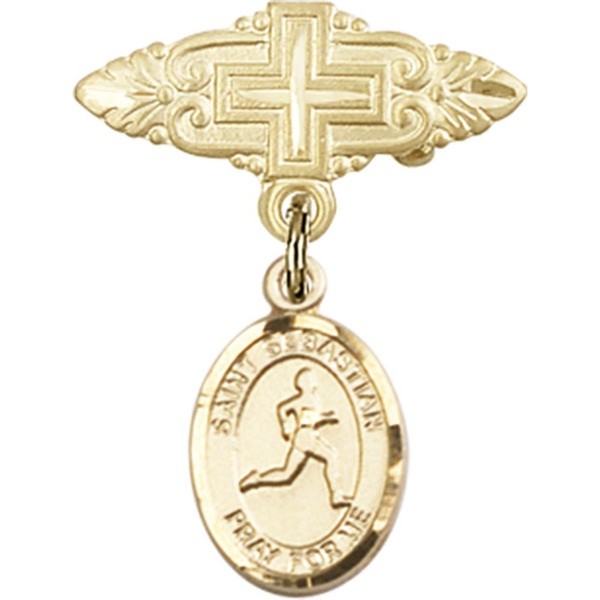 14kt Yellow Gold Filled Baby Badge with St. Sebastian/Track & Field Charm and Badge Pin with Cross