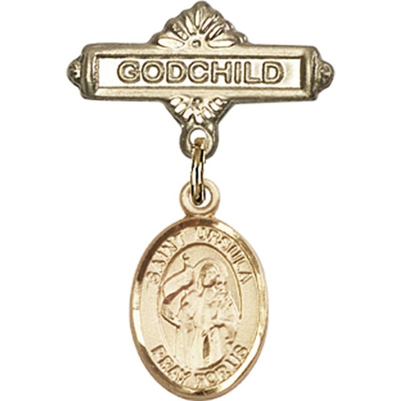 Bonyak Jewelry Saint Medal Collection Gold Filled Baby Badge with St. Ursula Charm and Godchild Badge Pin 1 X 5/8 inches