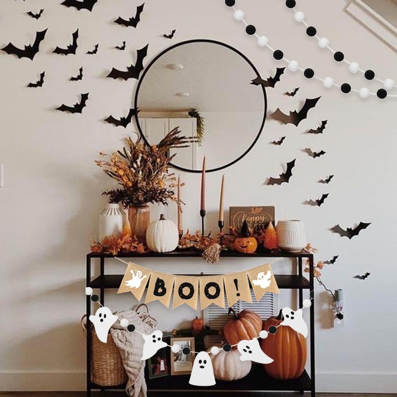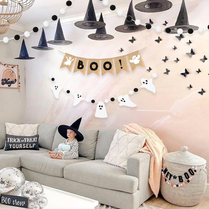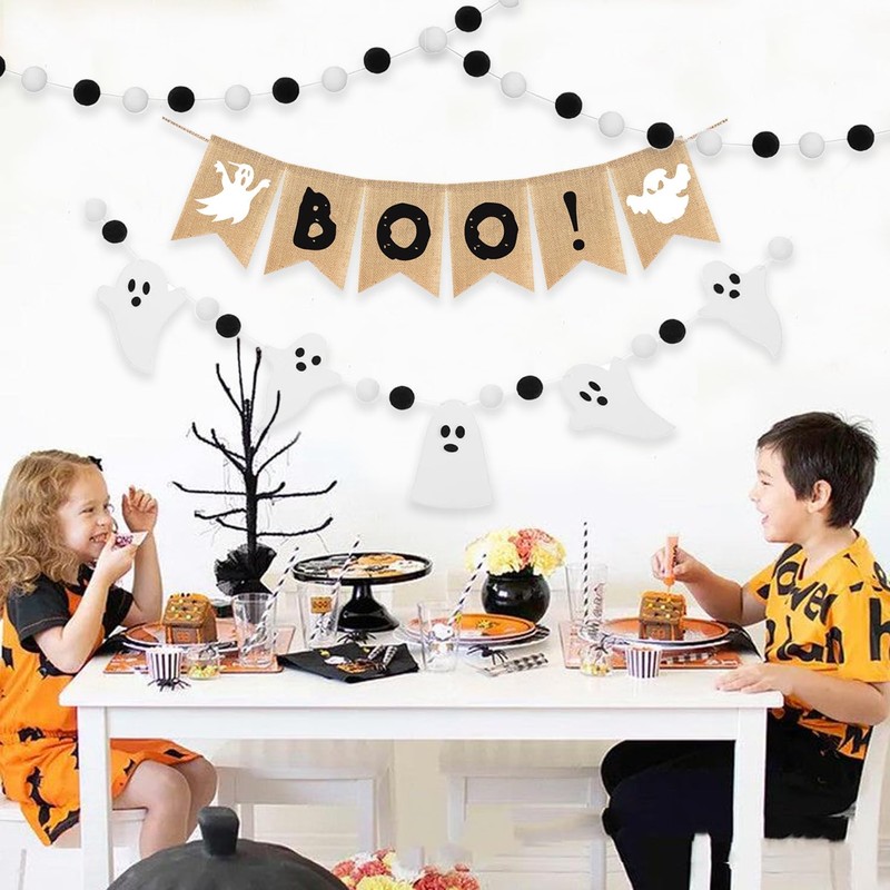 - **Unique Design:**Enhance your Halloween festivities with this delightful set featuring four stunning pieces: a whimsical "BOO" burlap banner, paired with a felt garland showcasing cute ghosts, also 2 pcs pom pom ball garland. Together, they create a magical ambiance that will enchant children and adults alike. Transform your home into a captivating haunted haven this Halloween with this eye-catching duo that perfectly Halloween season!