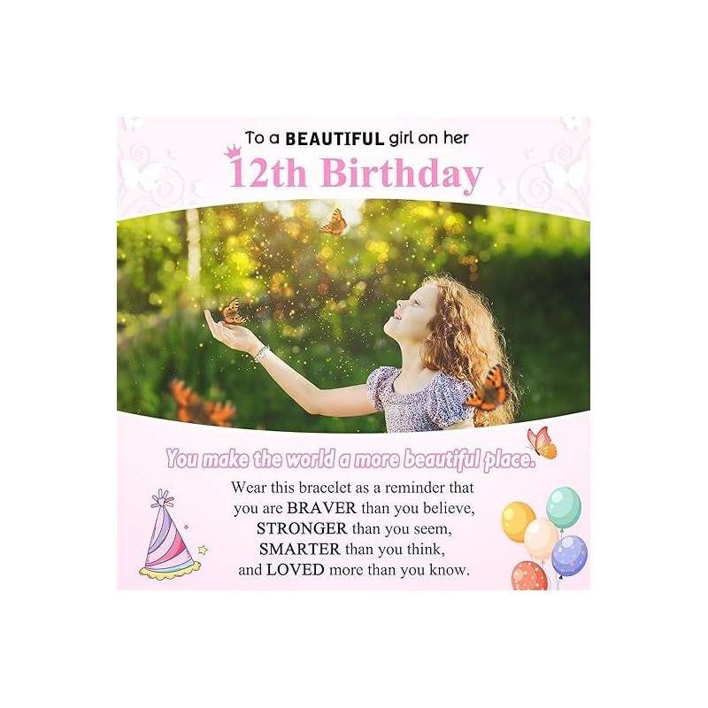 - 【Birthday Gifts for 12 Year Old Girls】Wear this bracelet as a reminder that "You are BRAVER than you believed, STRONGER than you seem, SMARTER than you think and LOVED more than you know." This beautiful butterfly charm bracelet express your best wishes for her 12th birthday, the best gift for your girl!