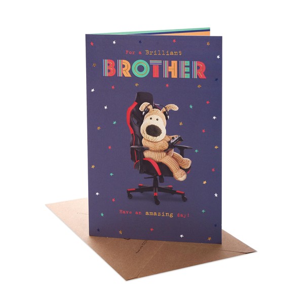 - Boofle’s enjoying time gaming on this cute birthday card for a brilliant brother. It’s printed on premium quality board with gold foil details.