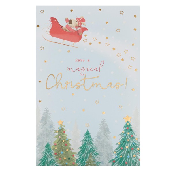 - Wish them a magical Christmas with this cute Boofle card featuring everyone’s favourite pup riding a sleigh accented with gold foil.