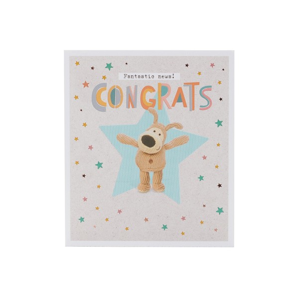 - Celebrate their fantastic news with this cute Boofle Congratulations card, printed on premium quality board and finished with copper foil.