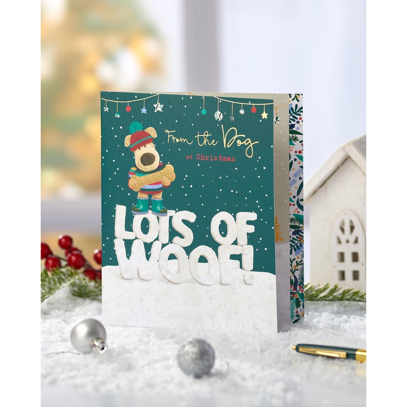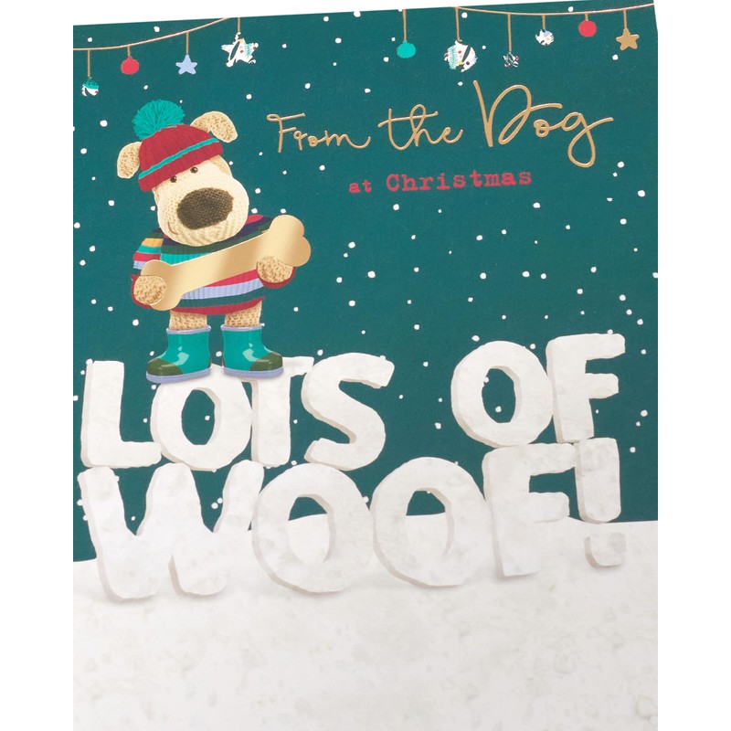- With help from adorable Boofle, send lots of woof and Christmas wishes from the dog with this cute card, finished with gold foil.