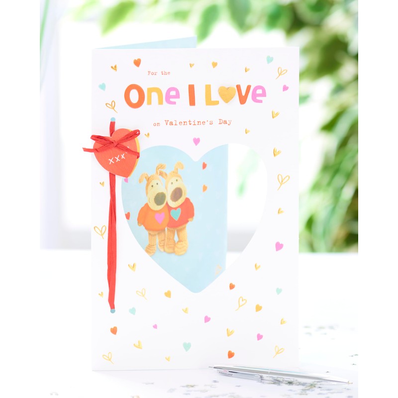 - Send Valentine's Day wishes to the one you love with this cute Boofle card, featuring adorable dogs in matching jumpers, printed on premium quality board with a raffia ribbon and a gold heart charm.