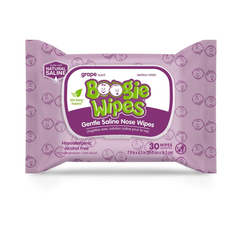 Boogie Wipes saline nose wipes are made with a patented, non-medicated natural and sterile saline formula, which dissolves kids' dried boogers and helps provide relief during cold, flu and allergy seasons and everyday irritation. Recommended by parents and pediatricians alike, Boogie Wipes are a gentle, easy alternative to dry tissues and can soothe even the most tender and sensitive noses. Since they are made with natural saline, these wipes are great for all ages - from congested infants and newborns to stuffy toddlers, even grown adults! Saline is naturally occurring in the earth and body and pediatricians regularly recommend its use for breaking up and clearing out snot, so you can rest assured your child’s cold or congestion symptoms will be relieved. Boogie Wipes also soothe and moisturize skin and noses with Aloe, Chamomile, and Vitamin E. Simple, easy-to-use and made with fun, 100% natural fragrances, these kid-friendly wipes encourage kids to blow their own nose. Boogie Wipes products are safe for all ages, can be used as often as needed and were created by moms for moms. Made with love in the USA and manufactured by ELEEO BRANDS.