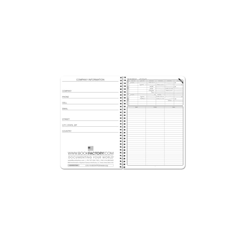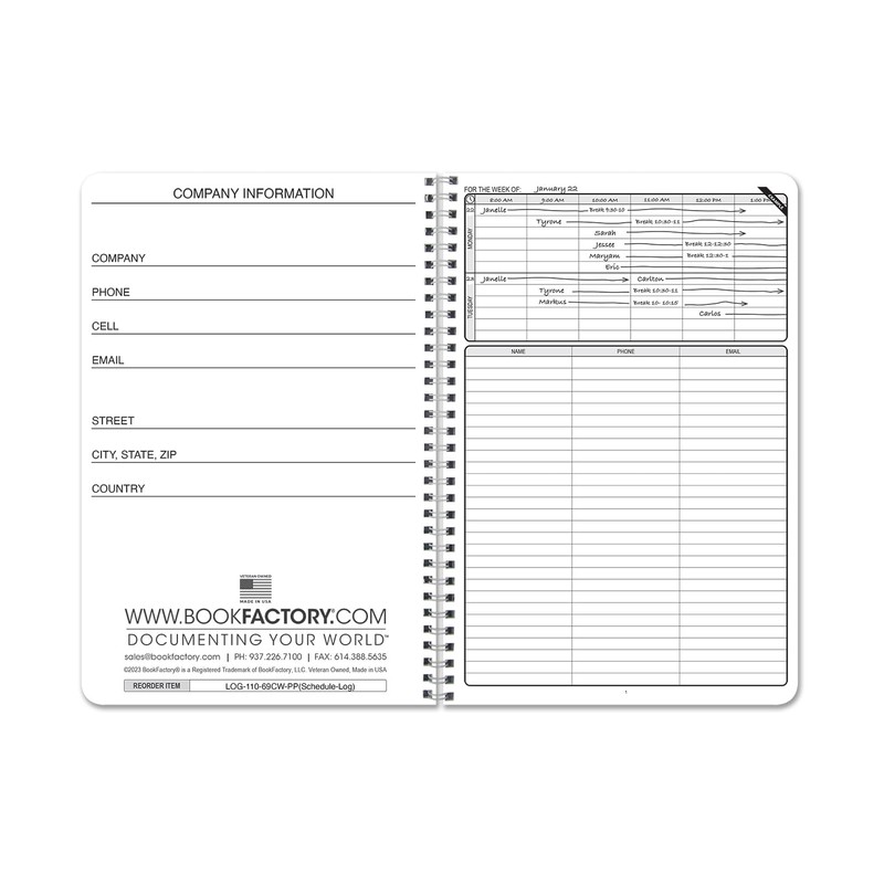 - This BookFactory Schedule log book tracks employee schedules by day and time