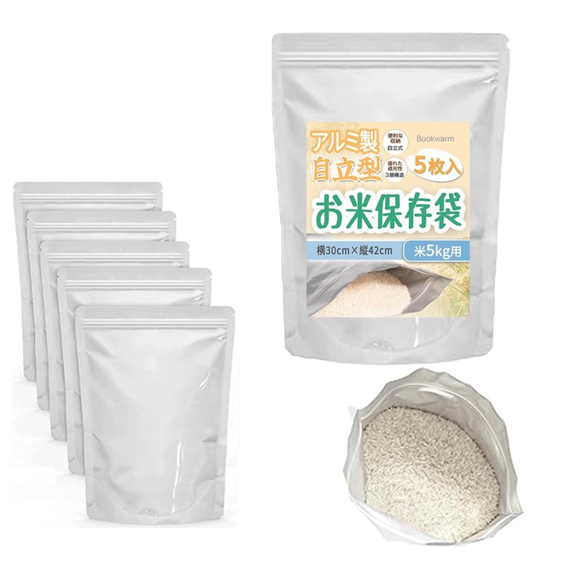 【Bookwarm】米袋 5kg 5枚入 米保存袋 お米保存袋 アルミ袋 特殊三層構造 自立型 丈夫 密閉 米びつ チャック付き袋 遮光袋 お米保存容器 米長期保存 防虫 防湿で鮮度, 空気 光や臭いを完全に遮断 繰り返し使用 (横30cm×縦42cm)