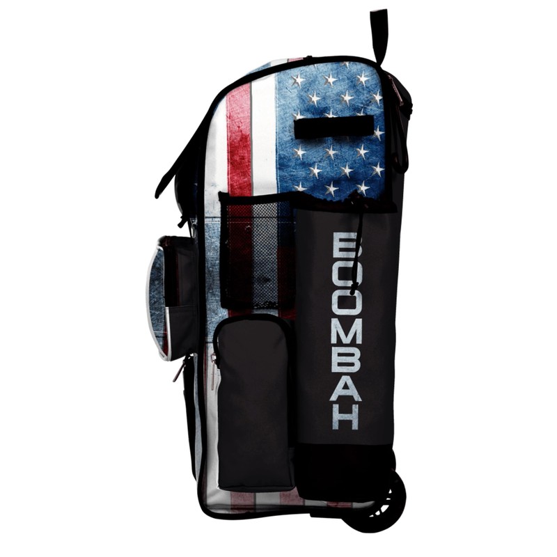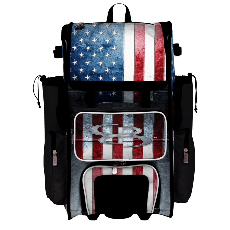 Boombah Rolling Superpack Baseball/Softball Gear Bag - 23-1/2" x 13-1/2" x 9-1/2" - Telescopic Handle - Holds 4 Bats - Wheeled Version - USA Shield Black/Royal Blue/Red