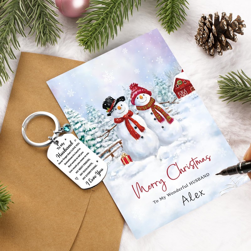 - Warm Design: Our Merry Christmas Card for Husband is designed with romantic snowmen patterns and the keyring designed with warm sayings , like “ Never forget that I LOVE YOU ”.