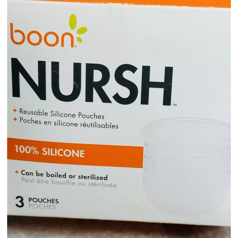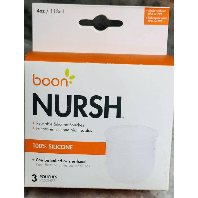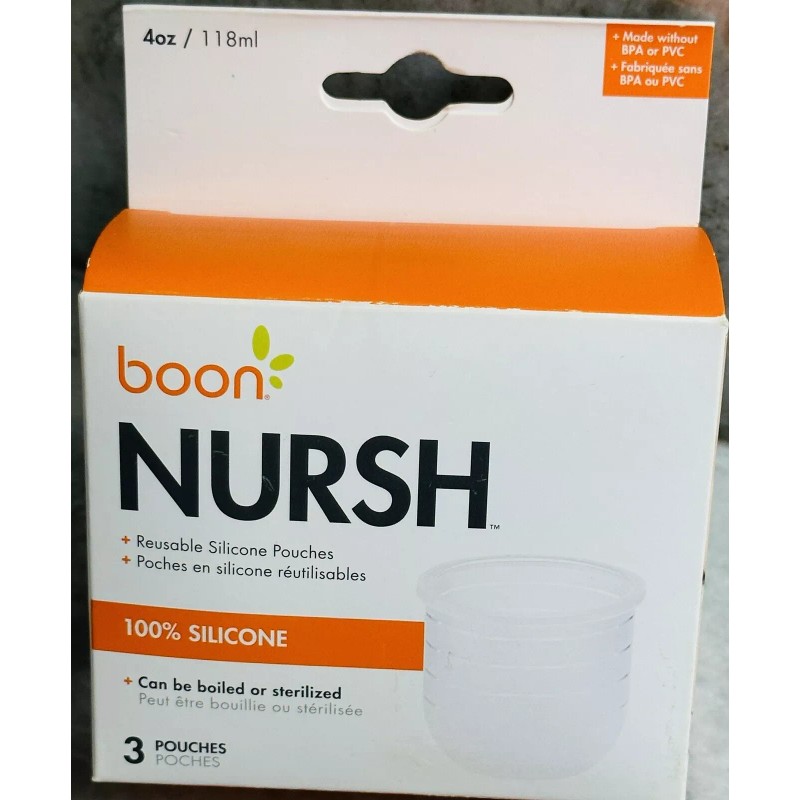 Introducing the Boon Nursh Silicone Pouch 3 Piece Pack, a perfect solution for your baby's feeding needs. This pack includes three 4-ounce pouches made of high-quality silicone material and equipped with nipples made of the same material. Each pouch has a shipping weight of 3.5 ounces and measures 2.8 x 2.8 x 2.5 inches in size.