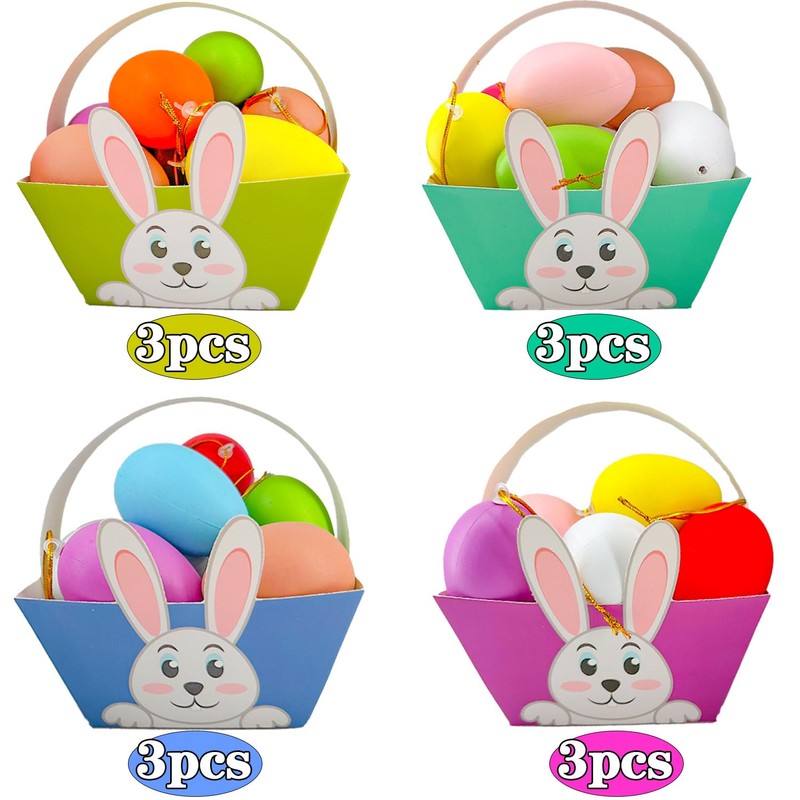 - Product configuration: includes 12 cardboard baskets and 12 cardboard handles. Each Easter basket has a cute cartoon pattern with chicks, rabbits, colourful eggs and lambs and other favourite motifs of children.