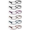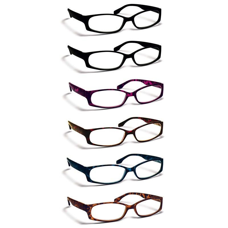 - VALUE: 6 Pairs of fashion-forward oval readers in solid black and tortoise shell colors including traditional brown, blue, red and purple, all in same magnification strength; Includes 2 microfiber cleaning cloths